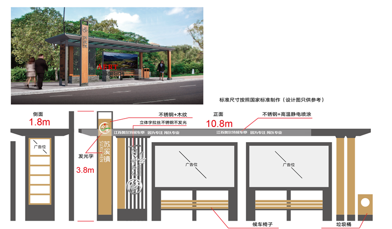 在顏色運用上仿古候車亭主要是采用灰色或者深咖啡色,因為加入了古典韻味,所以可以和周圍的古典建筑比較巧妙的融合在一起,更加突出城市的古典韻味,仿古候車亭的顏色深沉仿照古代風格效果逼真,不容易褪色,在視覺上給人們的感覺是有文化積淀的大氣效果,讓人仿佛置身于古代的情境中,感受古人的詩情畫意,讓人可以暫時遠離現代城市的喧囂和快節奏的生活,感受輕松的視覺效果,身心得到了放松和愉悅,而且在材料的選擇上,也是選用無污染的不銹鋼材料,對人體無污染,還可以保護環境的同時增加了城市的美感。江蘇奧爾特候車亭廠家自成立以來,便以“讓城市更美好”的企業理念,始終秉承宿遷候車亭廠家的優良品質和優良傳統,以擅長設計和近乎苛刻的產品品質體現的美觀與人性化。