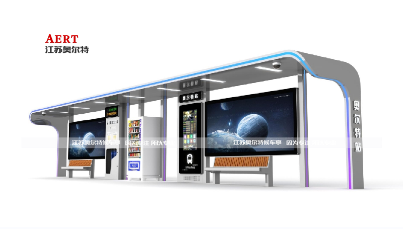 此款候車亭配備55寸報站液晶顯示屏,24小時實時監控客流量。液晶屏可以播放多媒體廣告、天氣預報、車輛實時位置,和預報站功能。