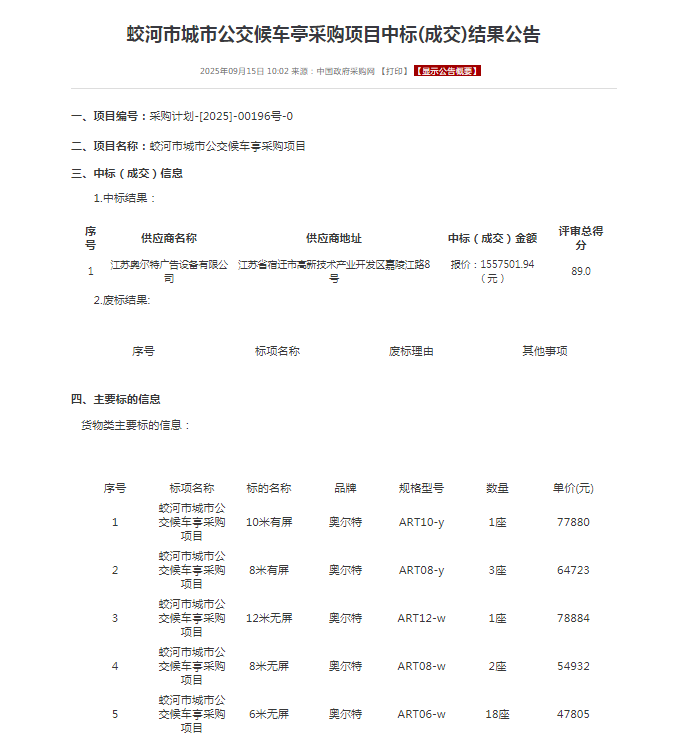 中標(biāo)喜訊!恭喜「江蘇奧爾特」中標(biāo) :蛟河市城市公交候車亭采購項目