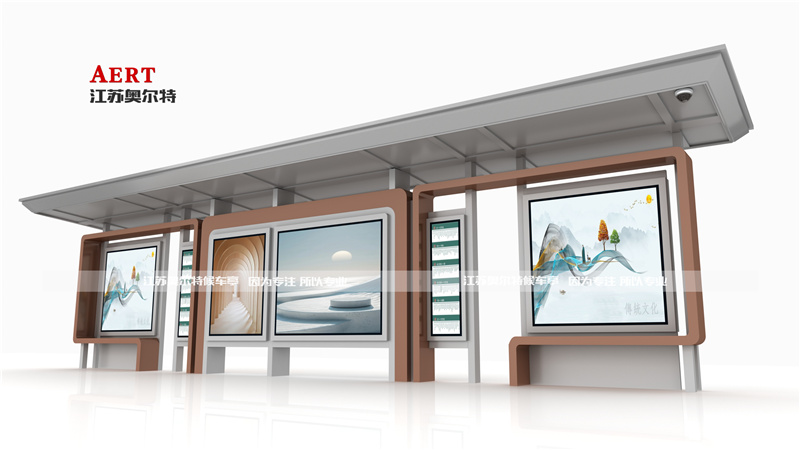 吉林延邊智能候車亭整體采用鍍鋅鋼板,噴涂淺灰色氟碳漆,搭配橙色裝飾,具有現代風格。